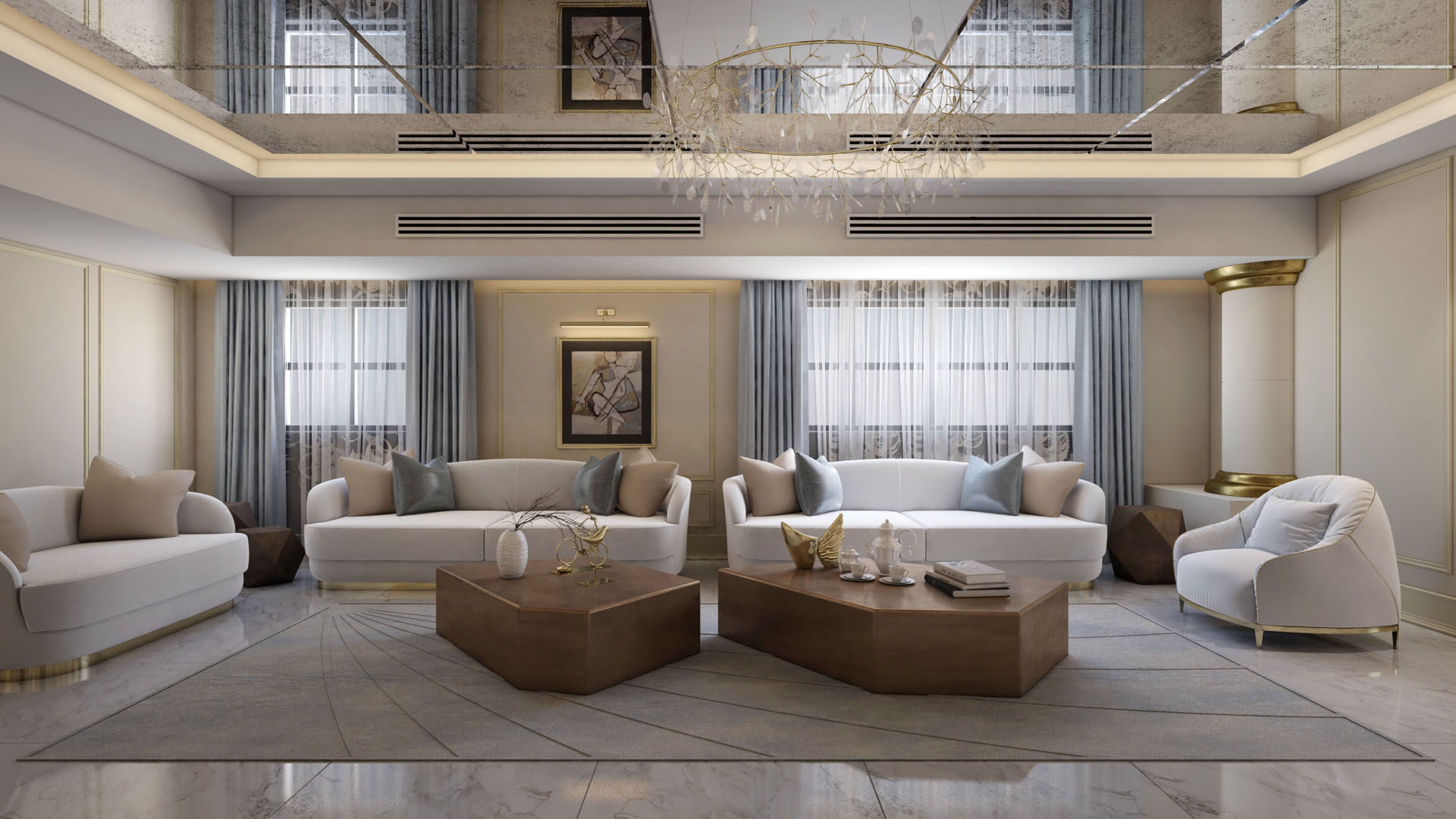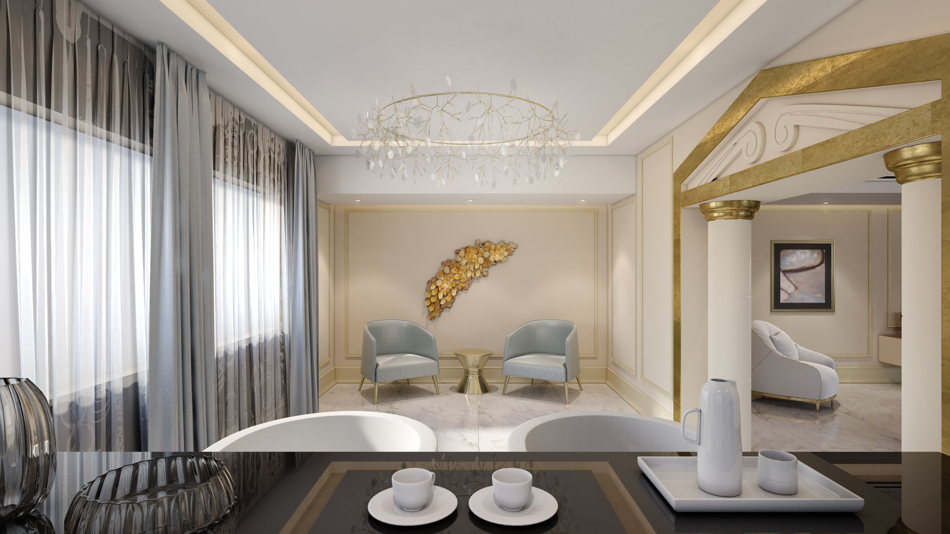 This space reflects a quiet sense of luxury, where classical references meet contemporary restraint. Soft neutral tones, refined wall detailing, and gold accents create depth without excess. Natural light, filtered through layered drapery, enhances the material richness, while sculptural elements add balance and identity. The result is a timeless interior defined by proportion, elegance, and calm continuity.