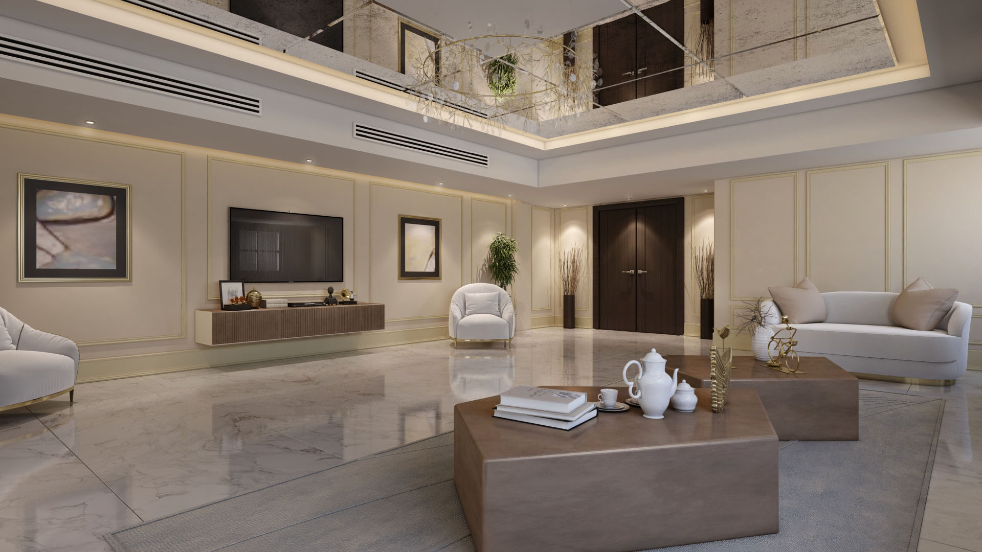 This living area is defined by symmetry, proportion, and quiet material richness. Soft neutral tones, natural stone flooring, and refined detailing create a calm architectural presence. Double-height volumes enhance spatial depth, while sculptural lighting and warm accents introduce balance and elegance. The space reflects a timeless approach where light, material, and form exist in harmony.