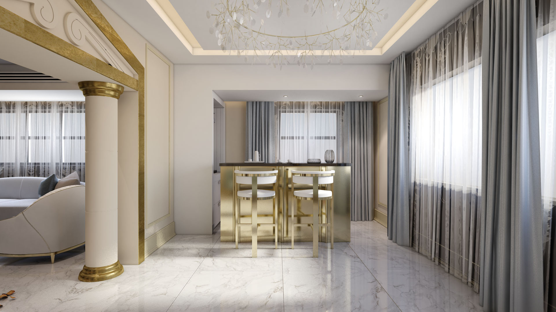 This bar area is designed as a refined architectural moment within the space, defined by clean geometry and material contrast. The gold-clad volume acts as a sculptural centerpiece, reflecting light and adding depth, while soft neutrals and natural stone flooring maintain visual calm. Framed by classical detailing and filtered daylight, the composition balances elegance with spatial clarity.