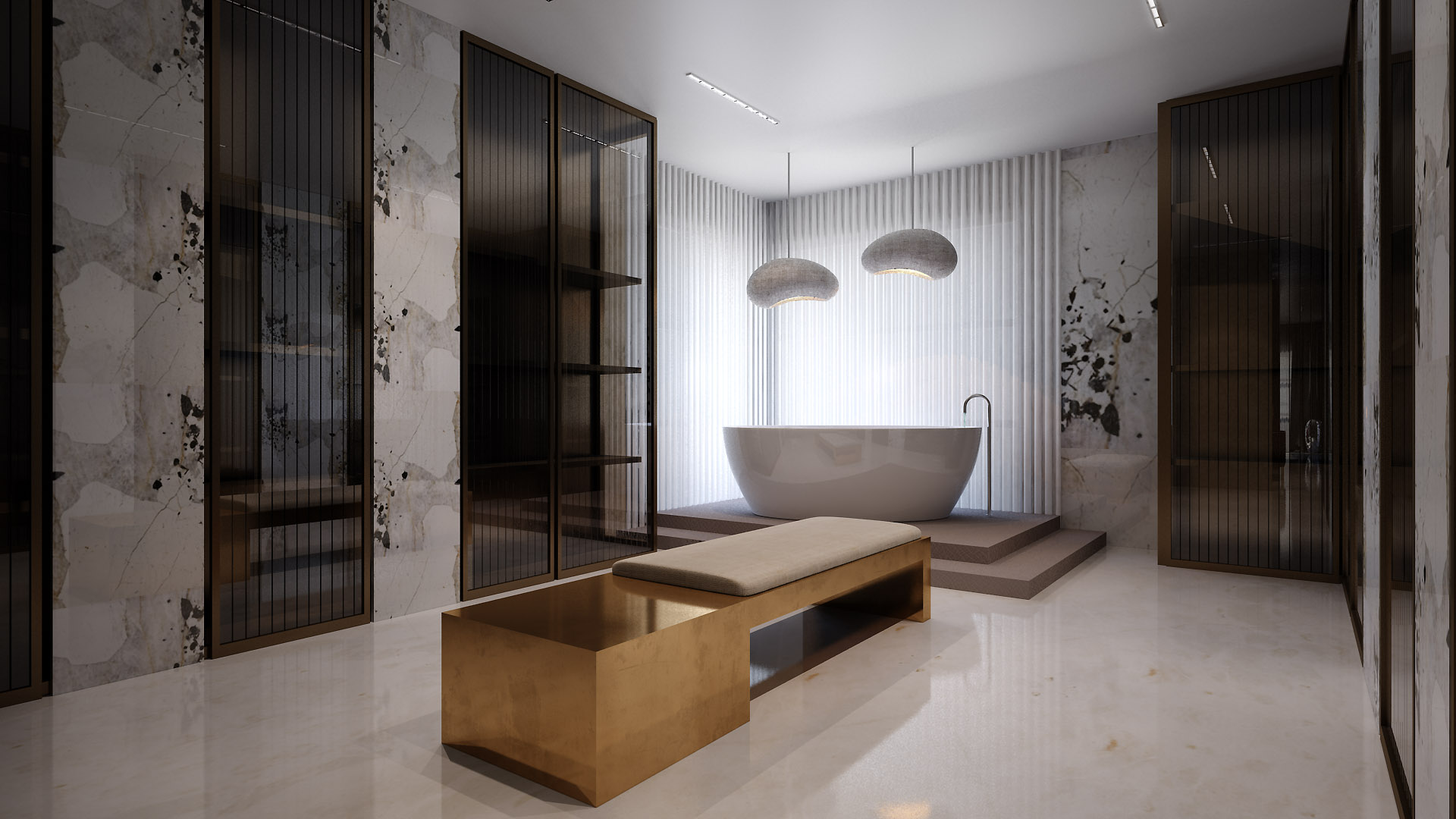 This bathroom is conceived as a sculptural retreat, where natural stone, soft light, and clean geometry create a calm architectural presence. The freestanding bathtub is elevated as a focal point, framed by textured surfaces and filtered daylight. Metallic accents introduce contrast, balancing material richness with spatial clarity and restraint.