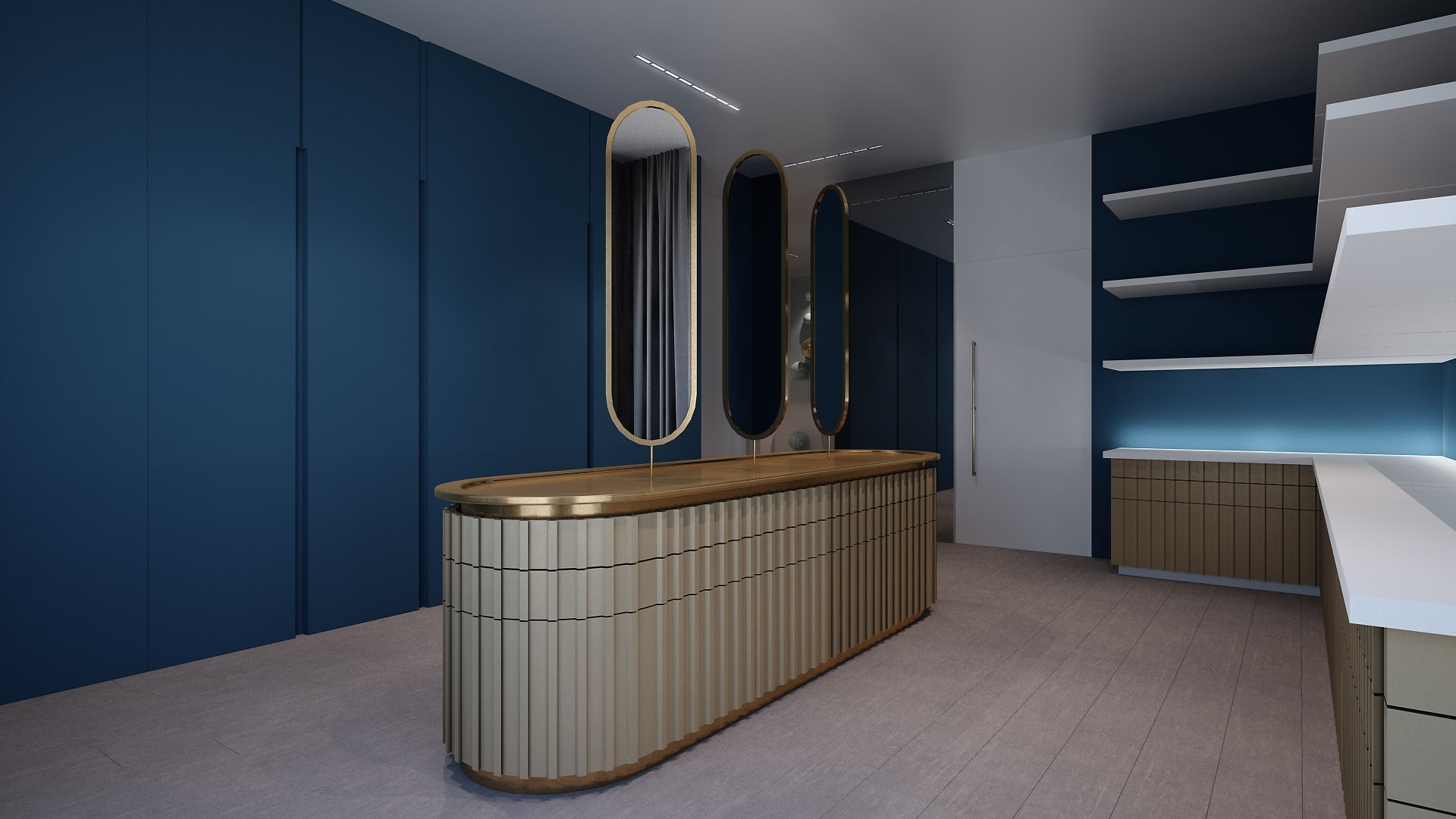 This dressing area is defined by clean lines and bold material contrast, where deep blue surfaces create a strong architectural backdrop. The central island, framed in metallic detailing, becomes a functional and sculptural anchor within the space. Vertical mirrors enhance height and reflection, reinforcing spatial depth. The composition balances precision, elegance, and contemporary clarity.