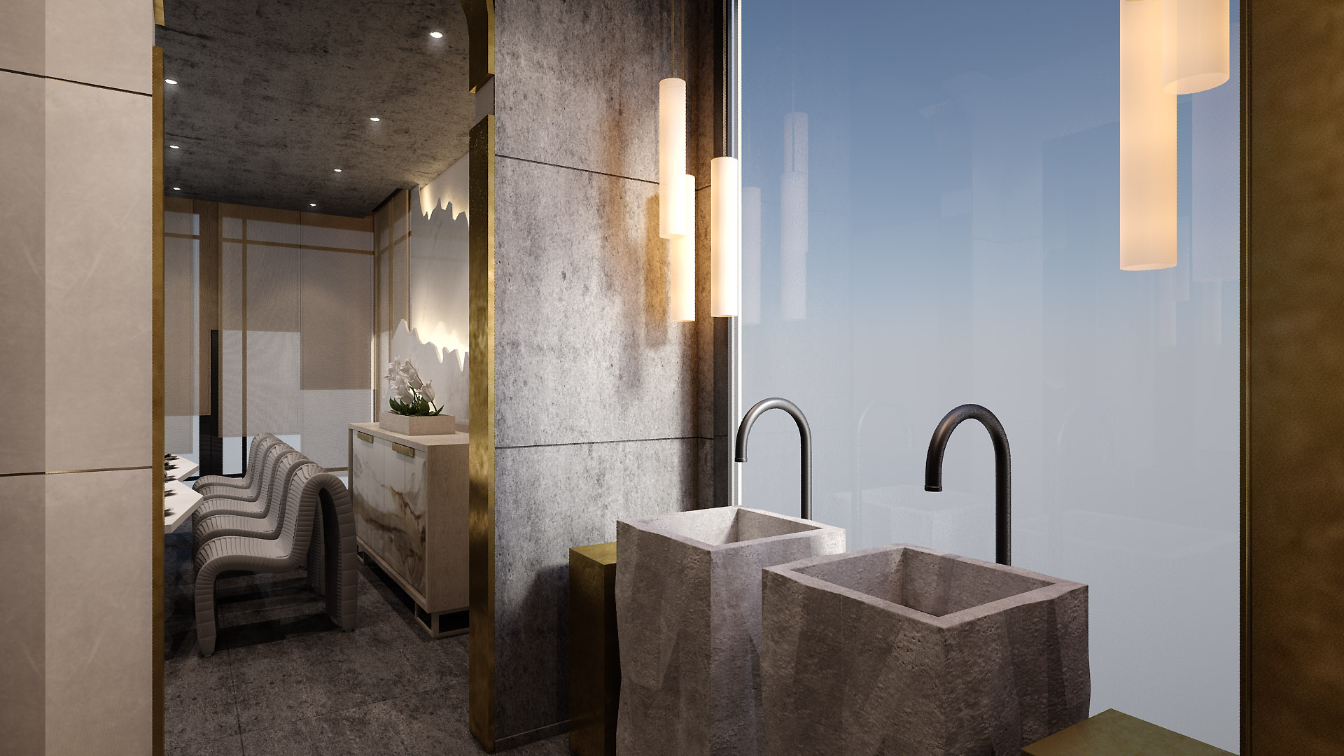 This bathroom is defined by material purity and sculptural simplicity. Monolithic stone basins emerge as architectural objects, complemented by warm metallic accents and soft vertical lighting. The restrained palette and clean geometry create a calm, tactile environment where light and material define the spatial experience.