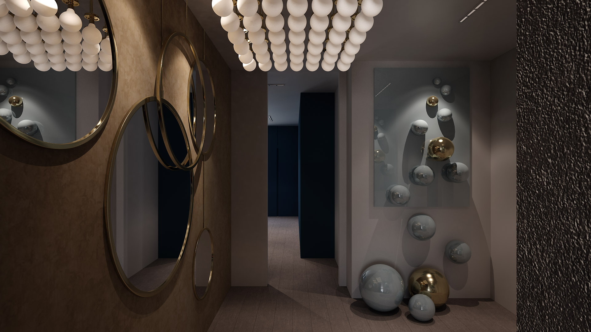 This corridor is conceived as an immersive spatial transition, where light, reflection, and material create a sculptural atmosphere. Circular mirrors and suspended lighting introduce rhythm and depth, while metallic accents and textured surfaces enhance contrast. The composition transforms movement through the space into a curated architectural experience.