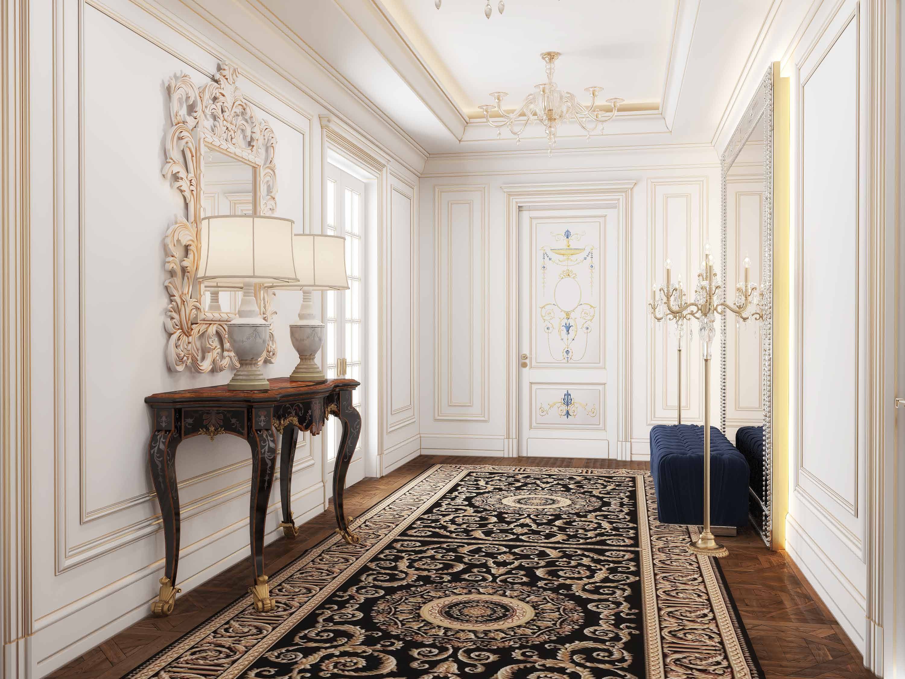 Defined by refined classical detailing and precise architectural articulation, the corridor reflects a timeless sense of elegance. Ornamental moldings, warm wood flooring, and curated furnishings create depth and visual continuity. Soft lighting enhances material richness, forming a composed and sophisticated transitional space.