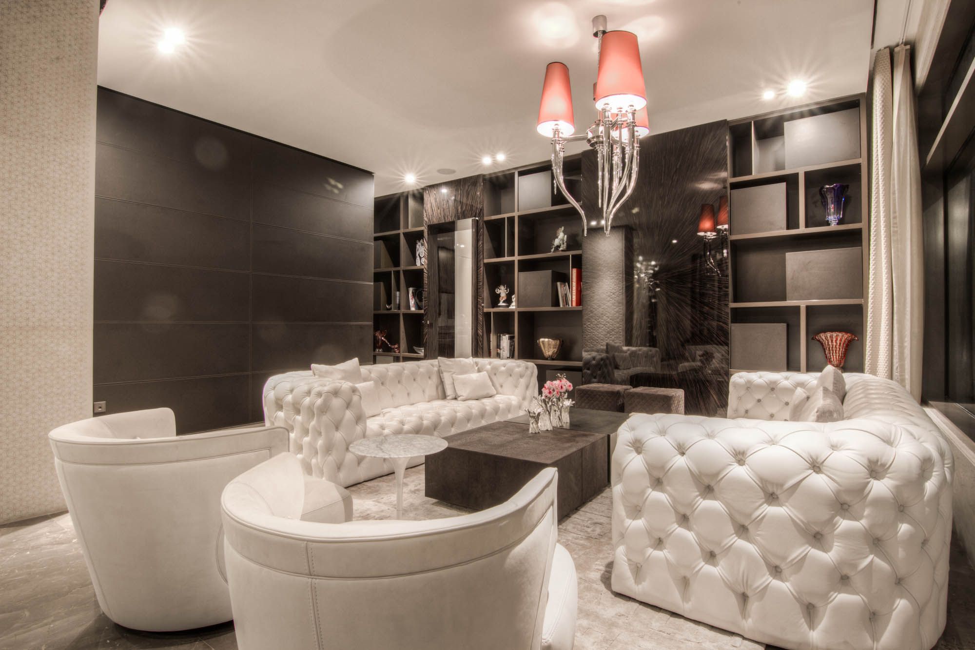 Rich material contrasts and sculptural lighting define this intimate lounge setting. Deep-toned wall surfaces create depth, while soft upholstered forms introduce comfort and balance. Integrated shelving and warm illumination enhance the architectural rhythm, resulting in a refined and immersive interior atmosphere.