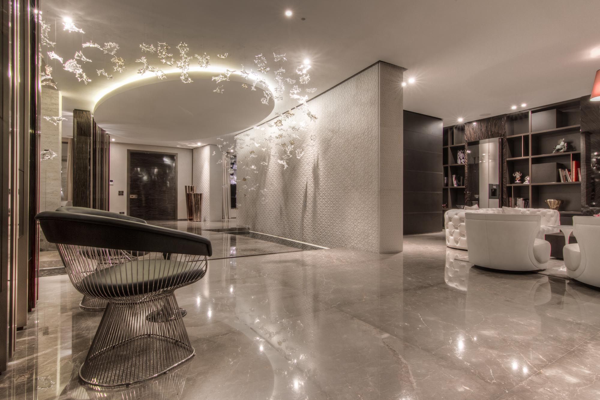 Defined by fluid geometry and atmospheric lighting, the space unfolds as a sculptural architectural composition. Reflective surfaces and soft illumination enhance spatial depth, while curated furnishings introduce balance and refinement. The result is an immersive environment where light, material, and form shape a calm and contemporary experience.
