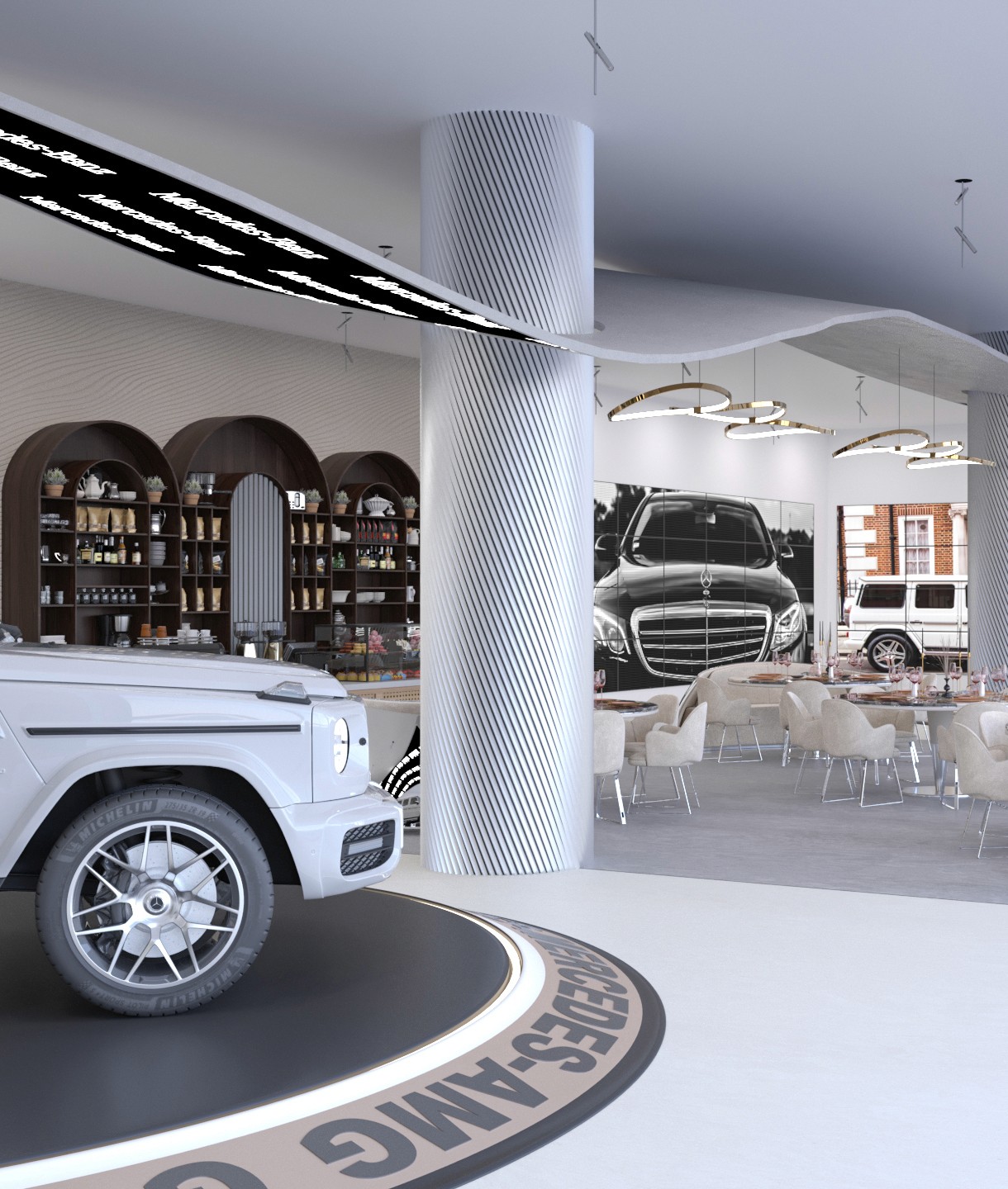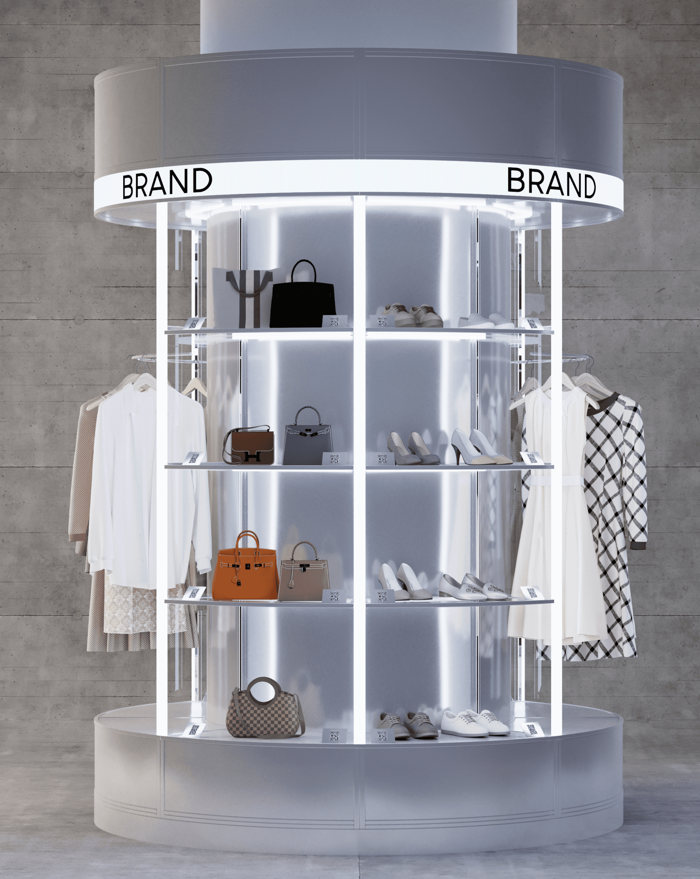 These spaces are designed around a structural column, transforming it into a rotating display. Products revolve 360 degrees around the column, creating a dynamic and visually engaging experience that maximizes functionality while seamlessly integrating with the environment.